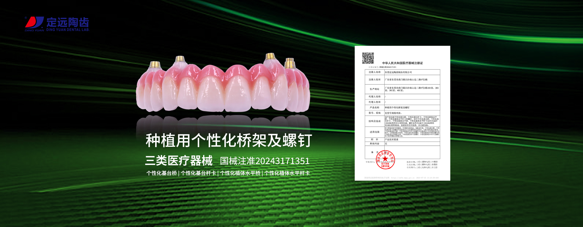 定遠為牙醫(yī)提供全面的義齒產(chǎn)品:LAVA、CERCON、微瓷、以及各類品牌氧化鋯全瓷牙,貴金屬瓷牙、SLM激光烤瓷牙、數(shù)字化切削純鈦支架、維他靈、BPD支架,以及各種類精密附件、套筒冠、金沉積等,種植上部修復(fù)、全口無牙頜種植修復(fù)、種植手術(shù)導(dǎo)板以及即刻種植修復(fù)產(chǎn)品等。